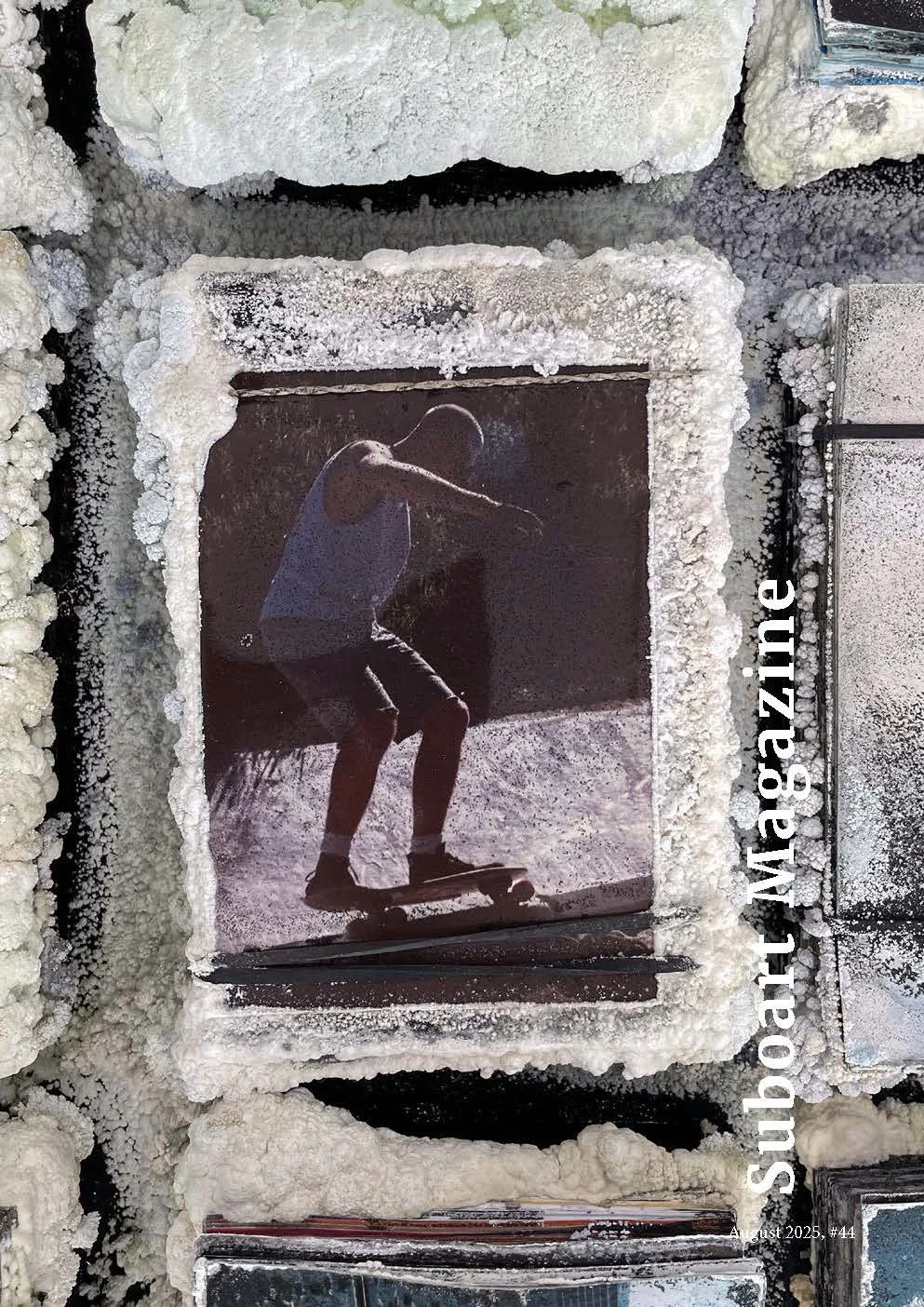A framed photograph of a skateboarder in a crouched position, surrounded by white-textured material with the words 'Subart Magazine' written vertically on the right side.