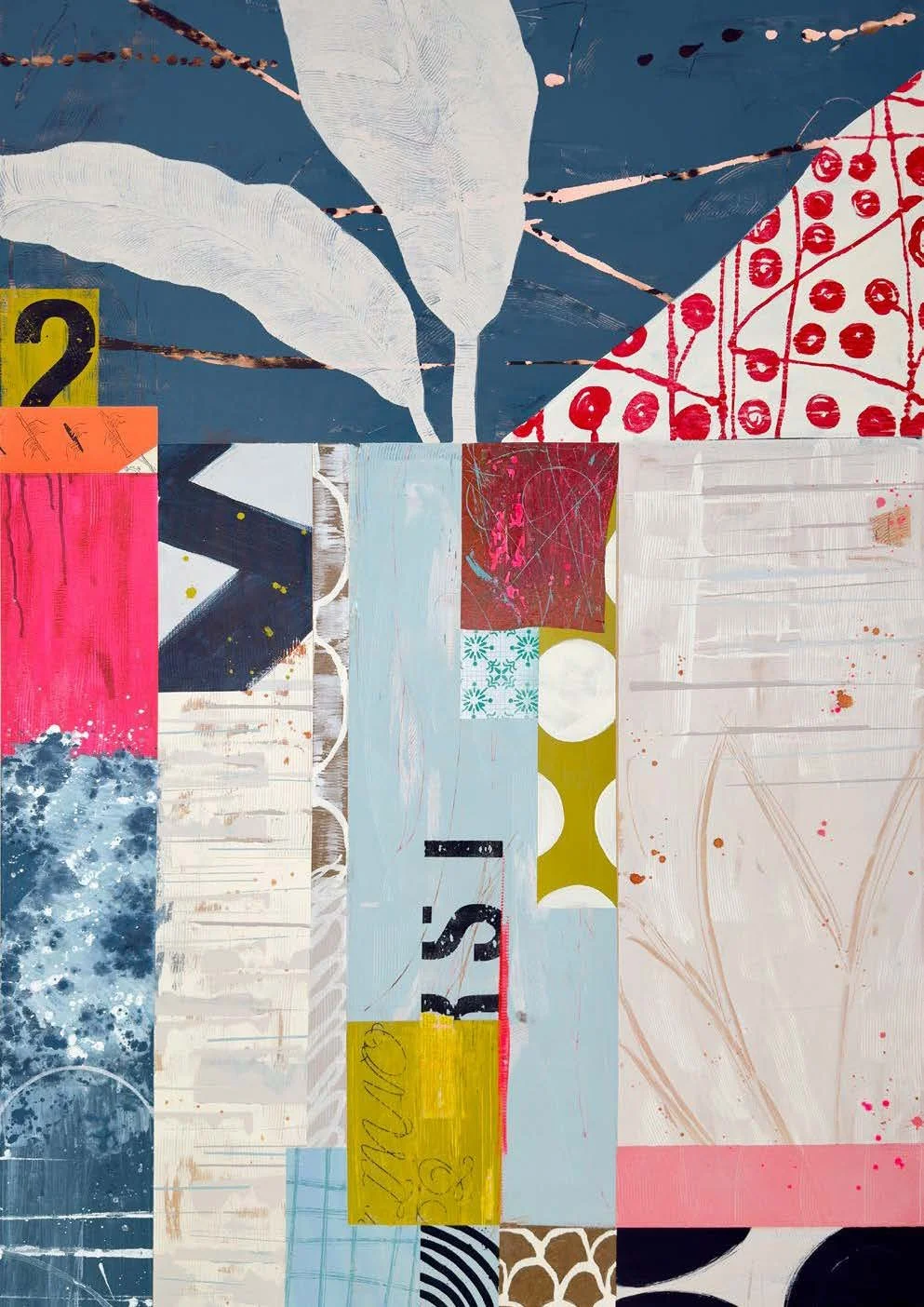 The Colorblock Collection, on the other hand, leans into my design background. It begins with painted collage papers, sometimes digitally arranged or pinned directly onto the canvas. These compositions are more structured, often featuring grid-like layouts, bold textures, and typographic elements. They're layered, maximal pieces with graphic punch.