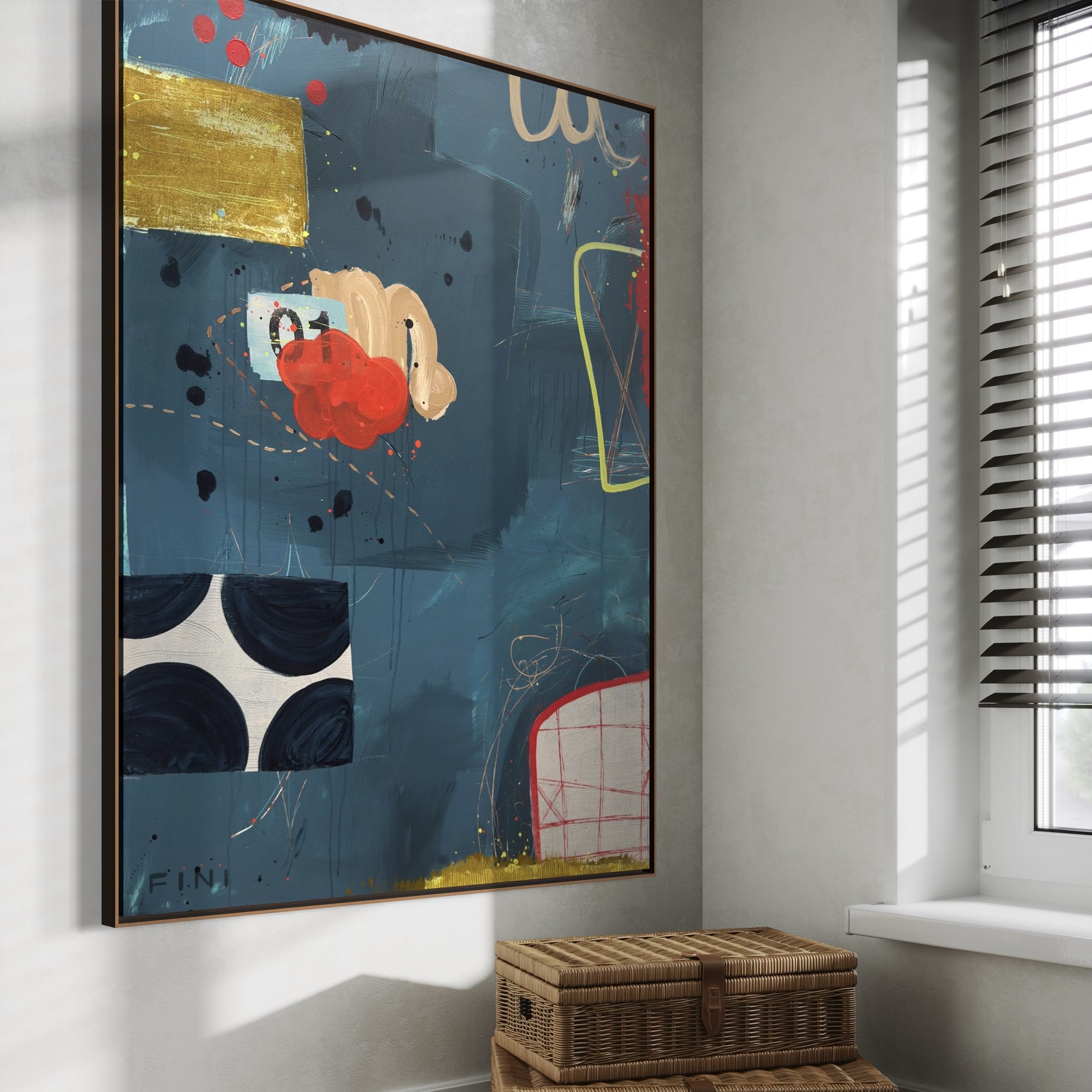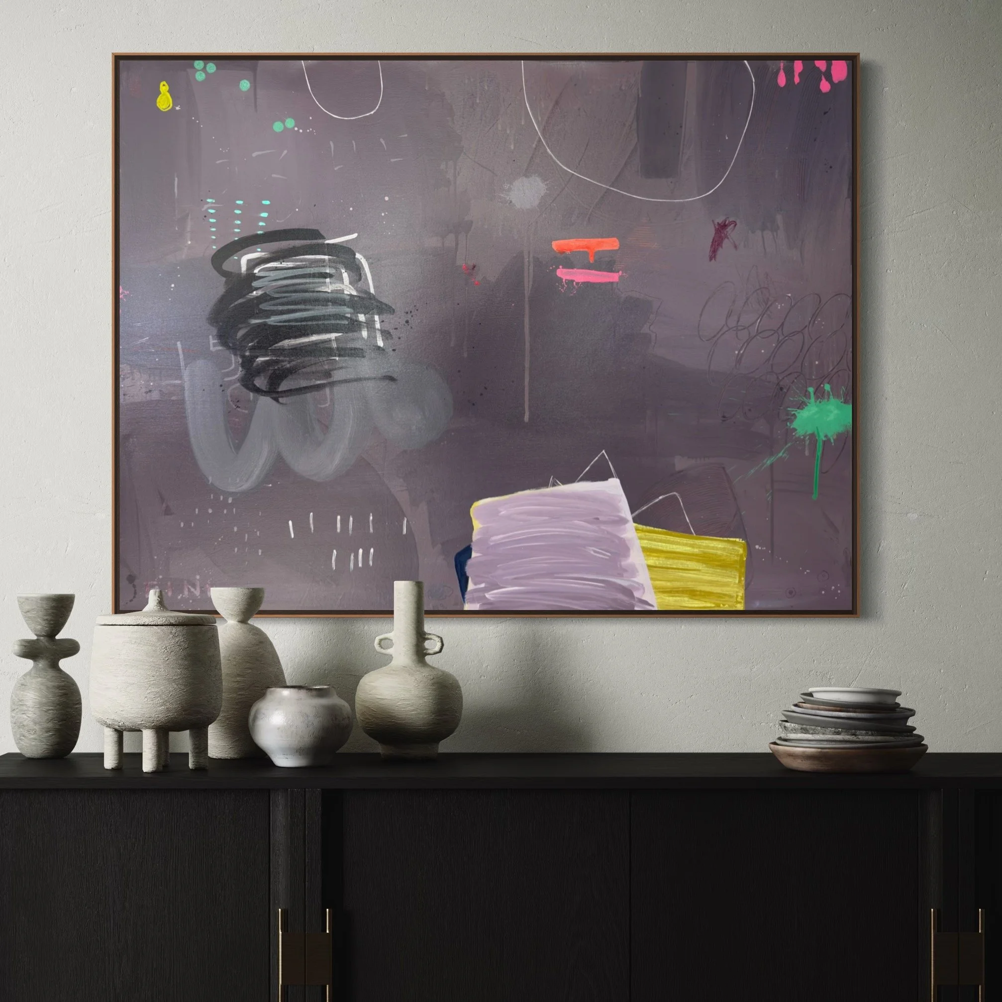 Created as a commissioned diptych, these two pieces are like a power couple—playful yet refined—connected but each bringing their own distinct personality to the conversation. One radiates playful energy that could wake up even the sleepiest wall, while the other stands tall with a powerful vibe that commands attention. Together, they strike up a dialogue on color, movement, form, and space.