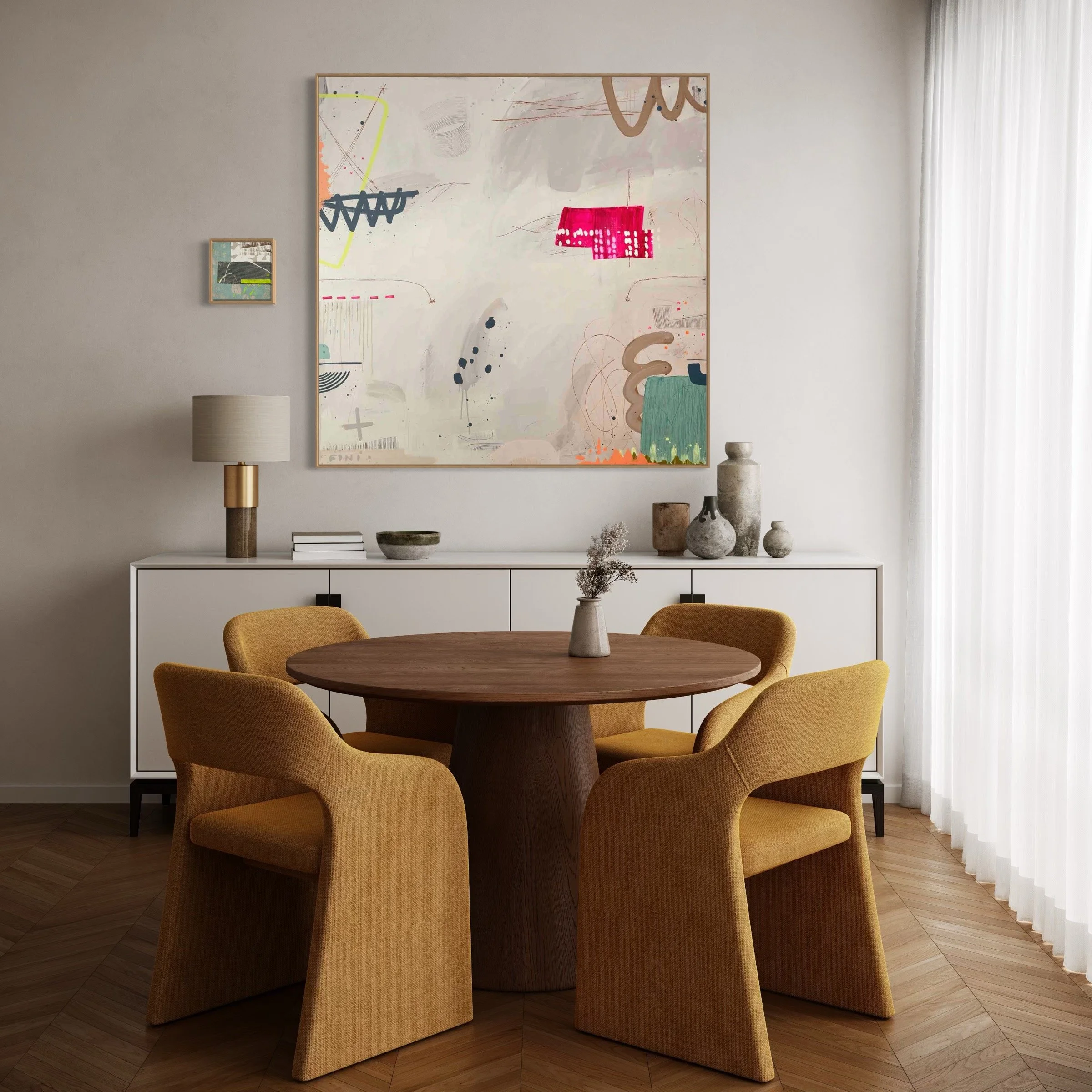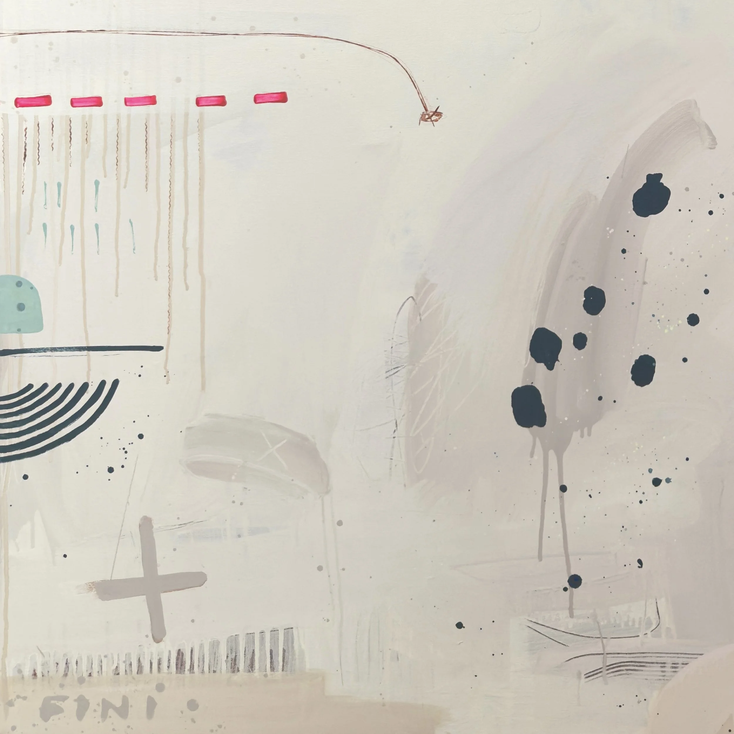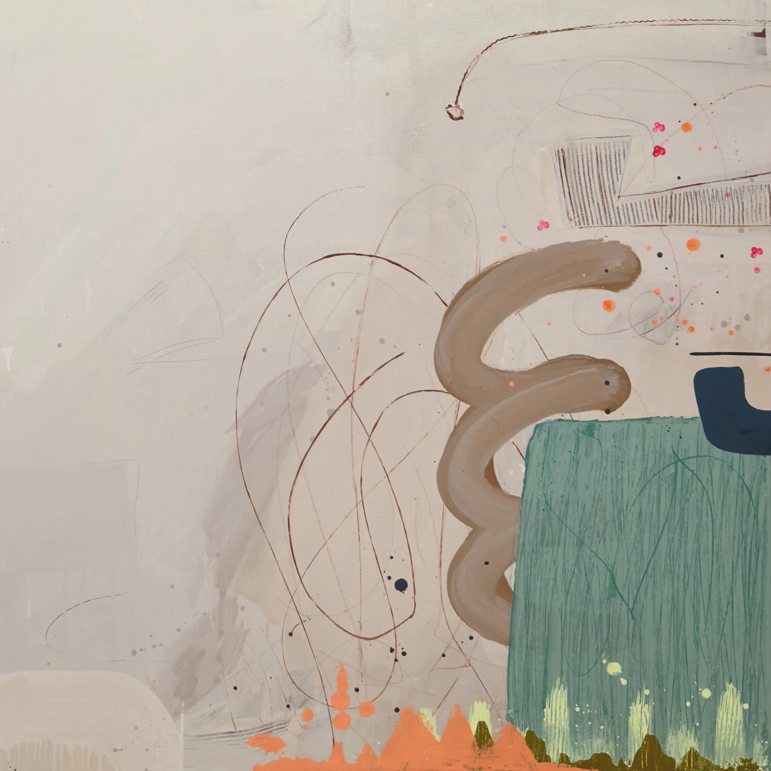 Each vertical band plays like a different track: fuzzy dots, grid lines, gestural scribbles, sharp stripes, and bloomed-out forms all colliding and conversing. It’s bold without shouting, maximal without chaos. There’s a looseness to it, but the composition holds with graphic confidence—like a playlist that somehow makes perfect sense, even when every song’s from a different genre.