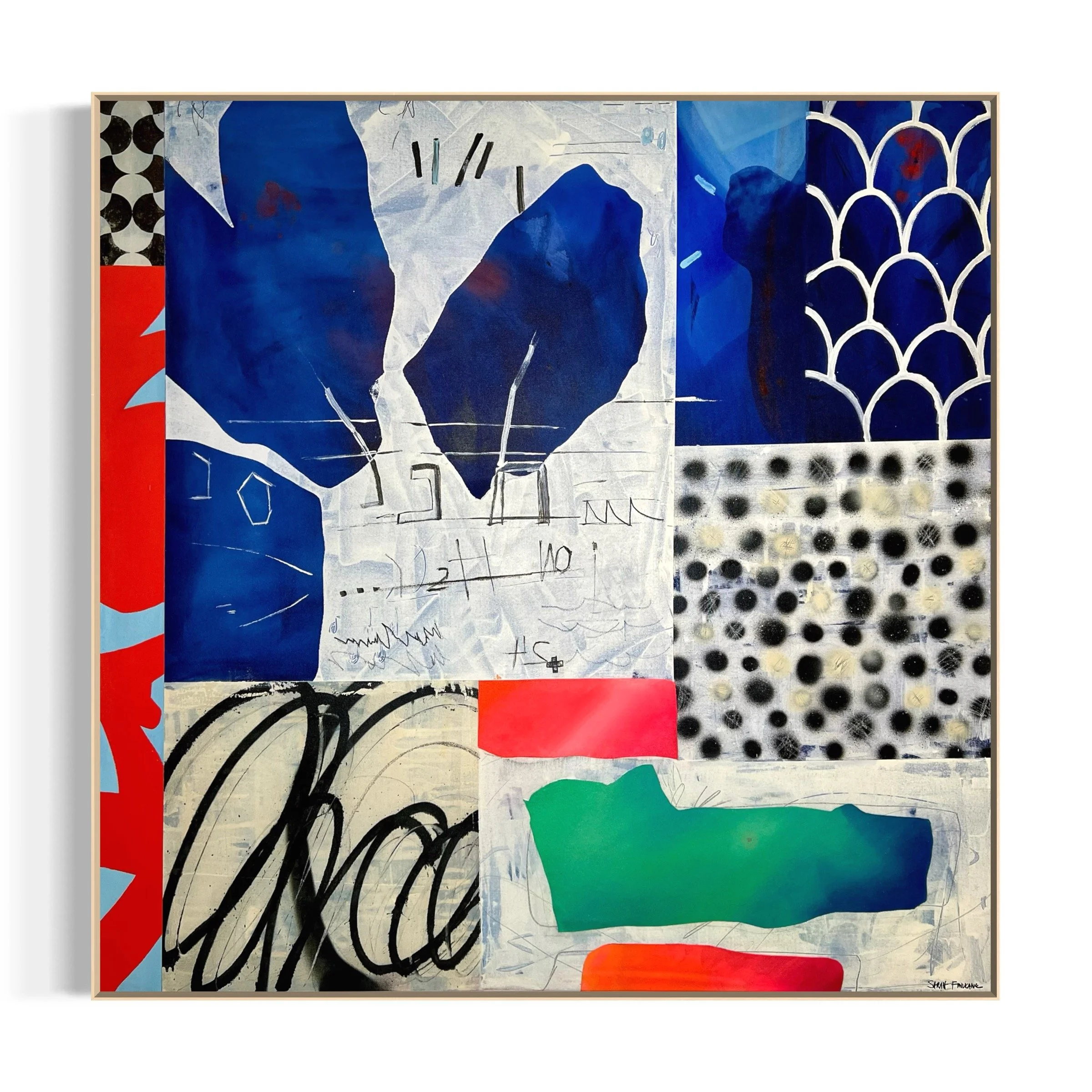 Framed in a natural wood floater frame (1.5" depth), wired, and ready to hang.